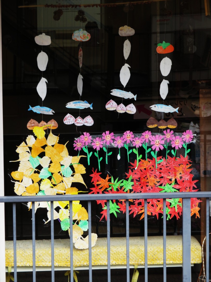 色づく紅葉、ぶどう、イチョウの紅葉、さつまいも、栗、シャケ、柿など秋の風景や作物がふんだんです。