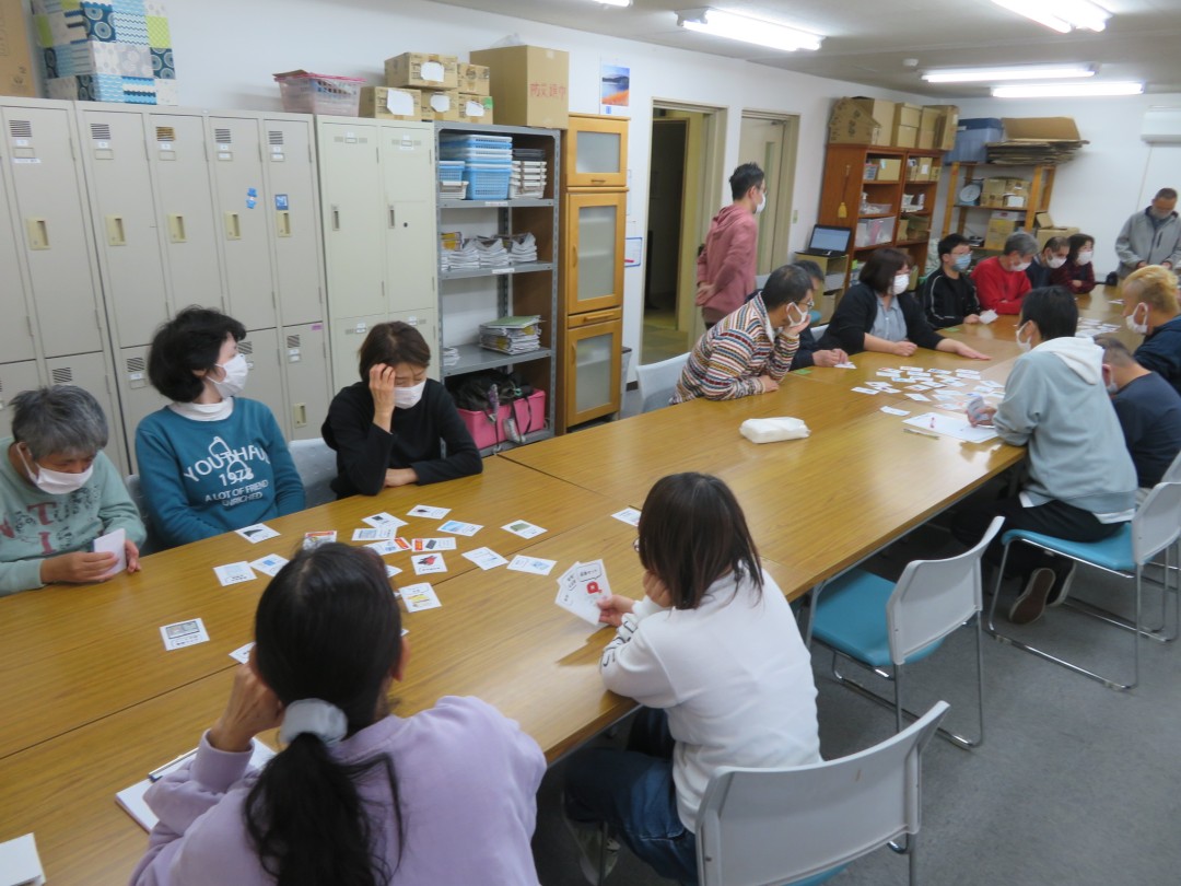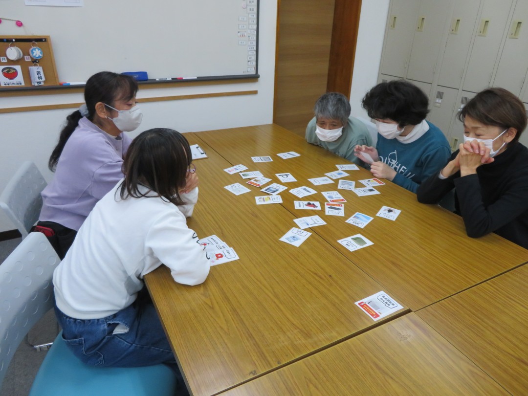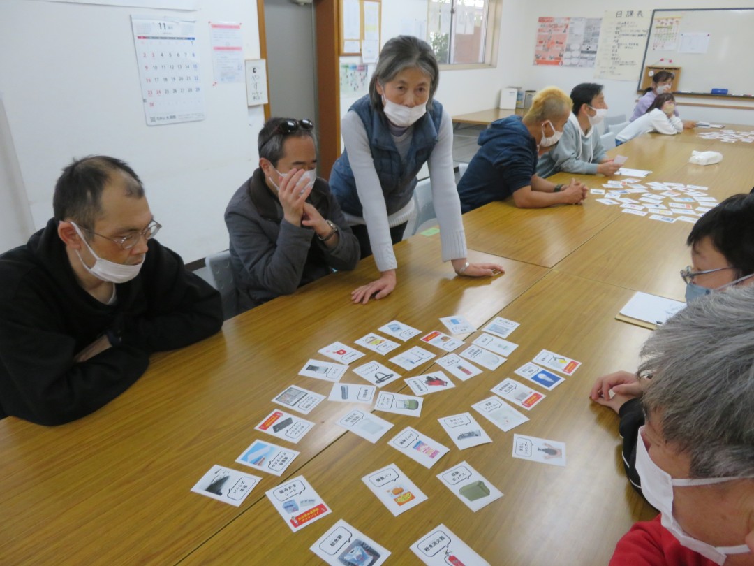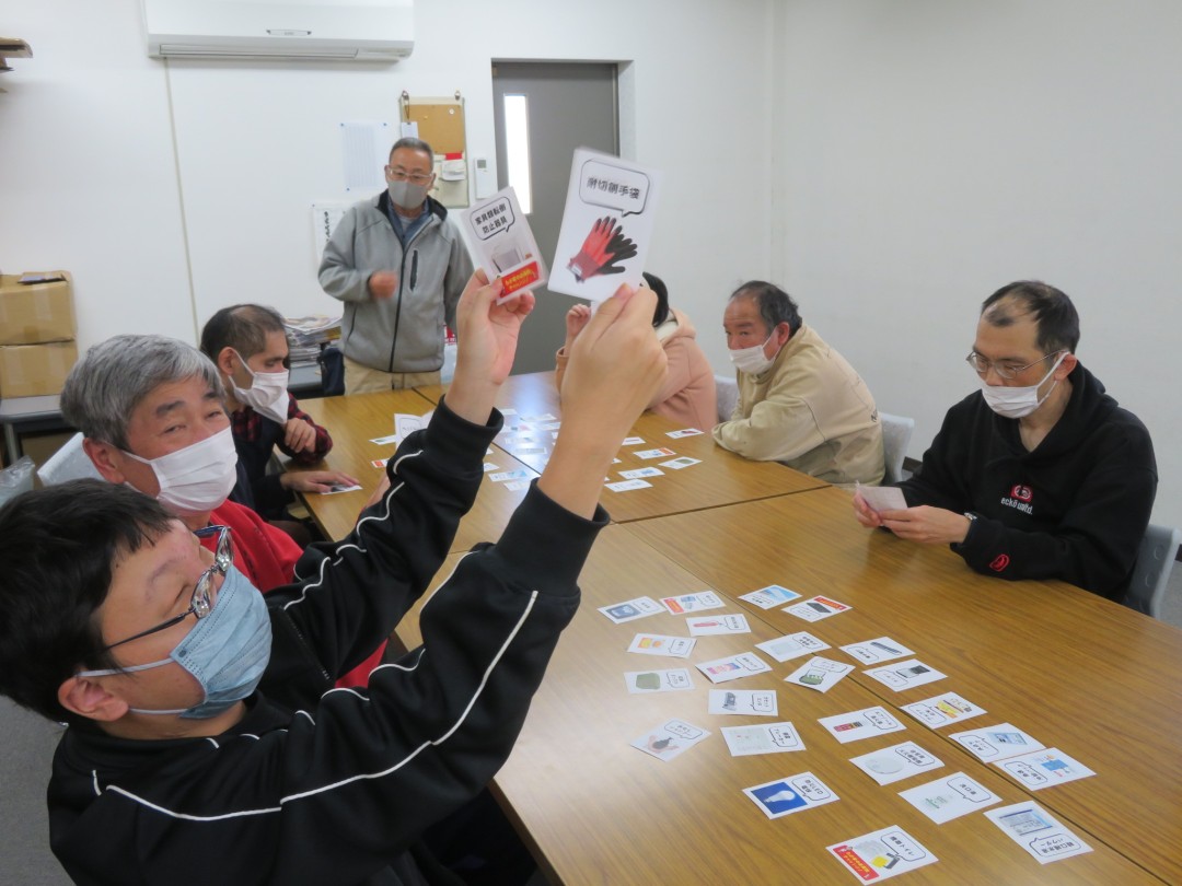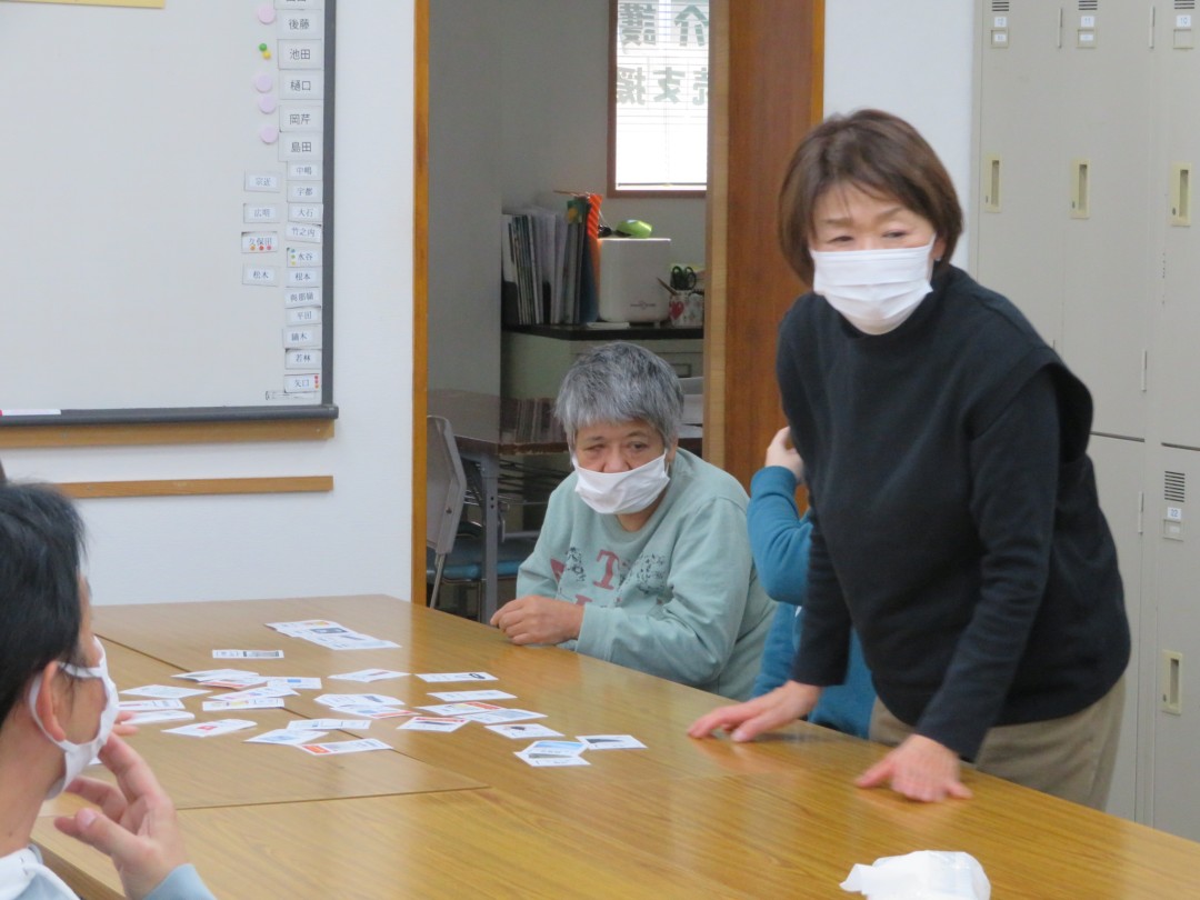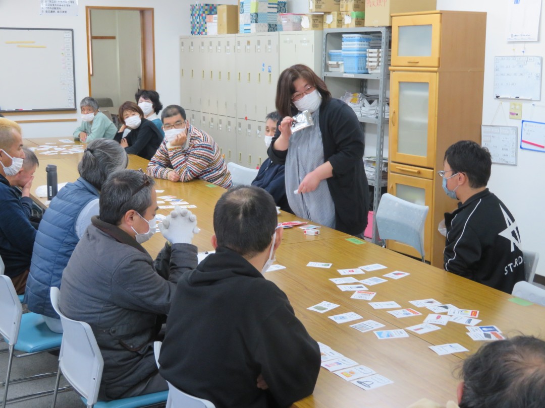 防災カルタを使い、タムの木の防災管理者である後藤副主任から説明を受け、皆さんが真剣に意見を出し合いました。