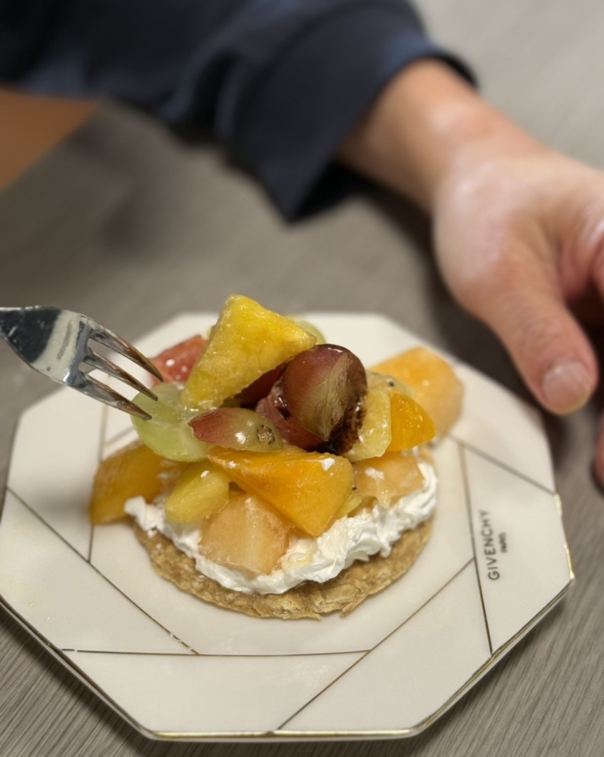 生地はクッキーを砕いてO職員が作り、トッピングのフルーツを利用者さんが行いました。