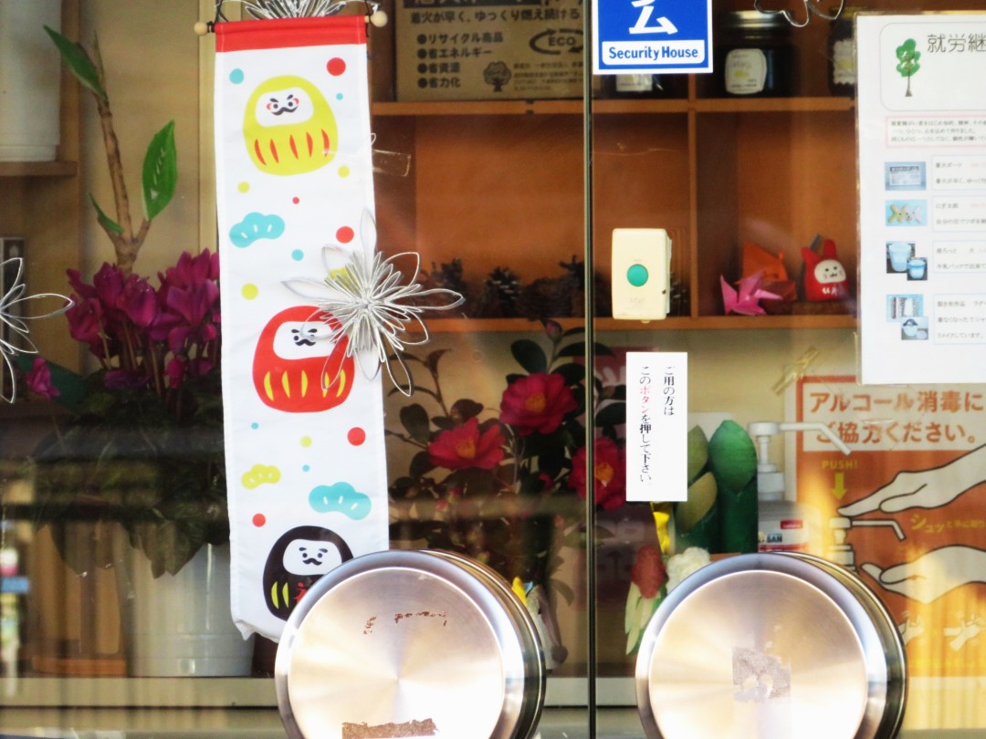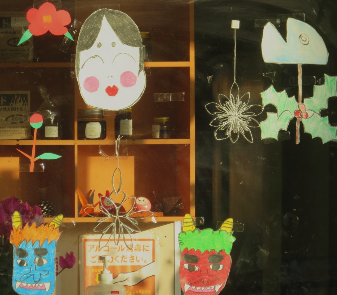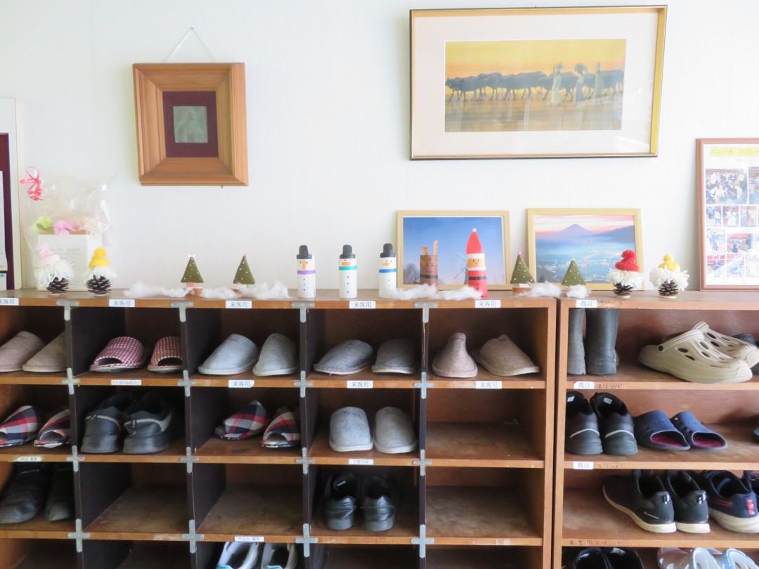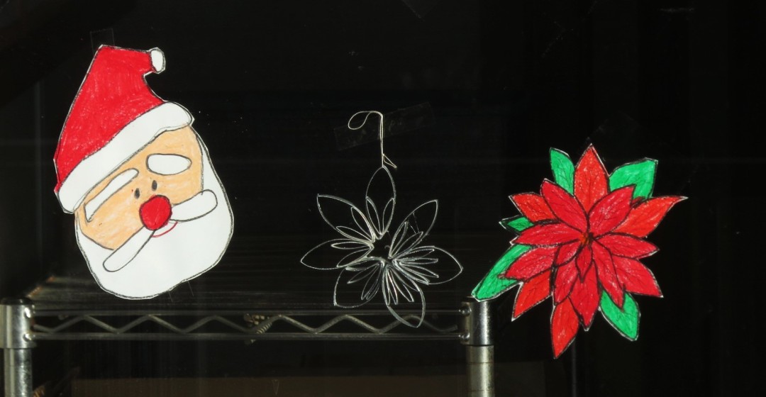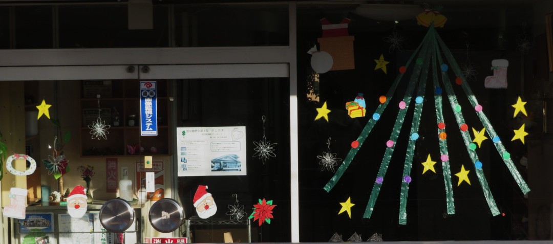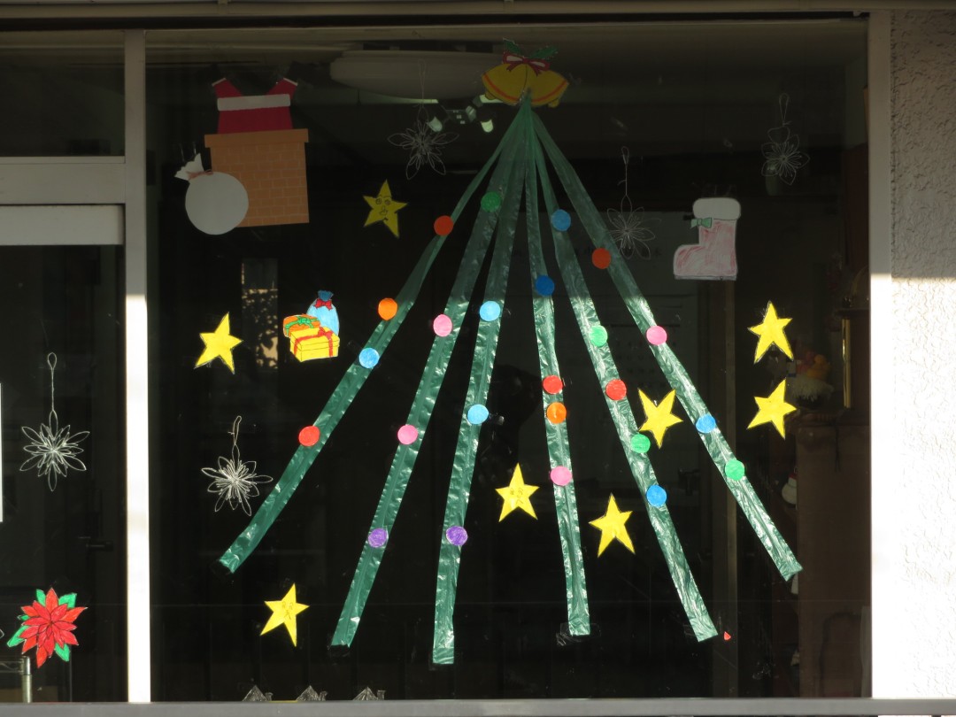 玄関内(靴箱の上部ディスプレイ)のサンタさんに続き、玄関のガラス面に、クリスマスツリーやサンタさんのディスプレイが飾られました。