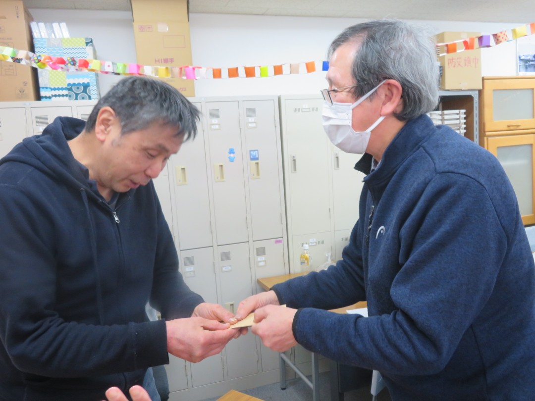 就労継続支援B型事業所に所属されていた五名の方が、生活介護事業所へ移られ施設長から「配属書」が手渡されました。